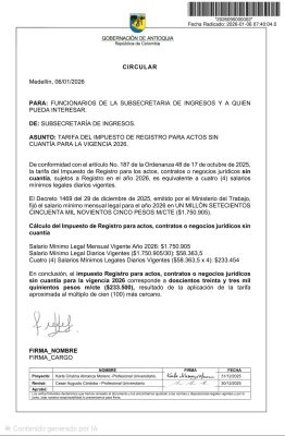 Sin categoría Tarifa del impuesto de registro paa actos sin cuantía para la vigencia 2026 Publicado el 6 de enero de 20267 de enero de 2026 por notario 06 Ene notario Comunicado del Colegio Nacional de Curadores urbanos